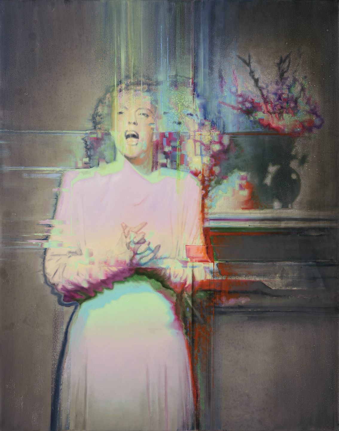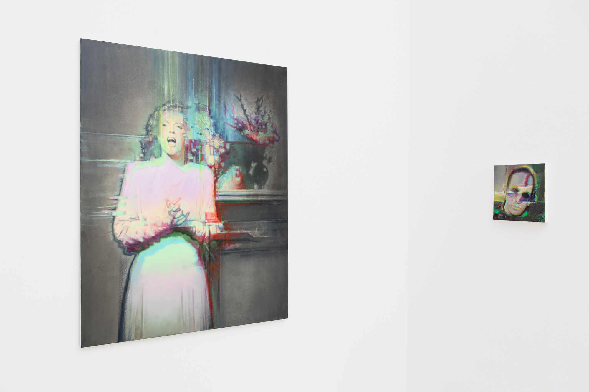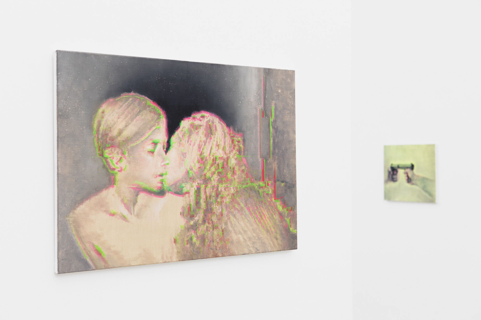 In his painting Complementary Love, an intimate kissing scene is disrupted by green and red lines that refer to the phenomenon of digital noise, turning this peaceful, idyllic moment into something that suddenly looks as though viewed through a damaged data file or a mediating technological device. As usual, the depiction of a fragmented reality and the appearance of digital glitches play significant role in Szűcs’s latest works. The figure of the Disappearing Singer or the portrait of Bergman seems to dissolve into space before blurring into pixels and disappearing into the ether. This image-glitch is not merely an aesthetic device but also symbolizes the transience of identity, memory, and presence, while Szűcs makes clear references to the world of cinema, especially to creators known for their surreal atmospheres (David Lynch, Ingmar Bergman).