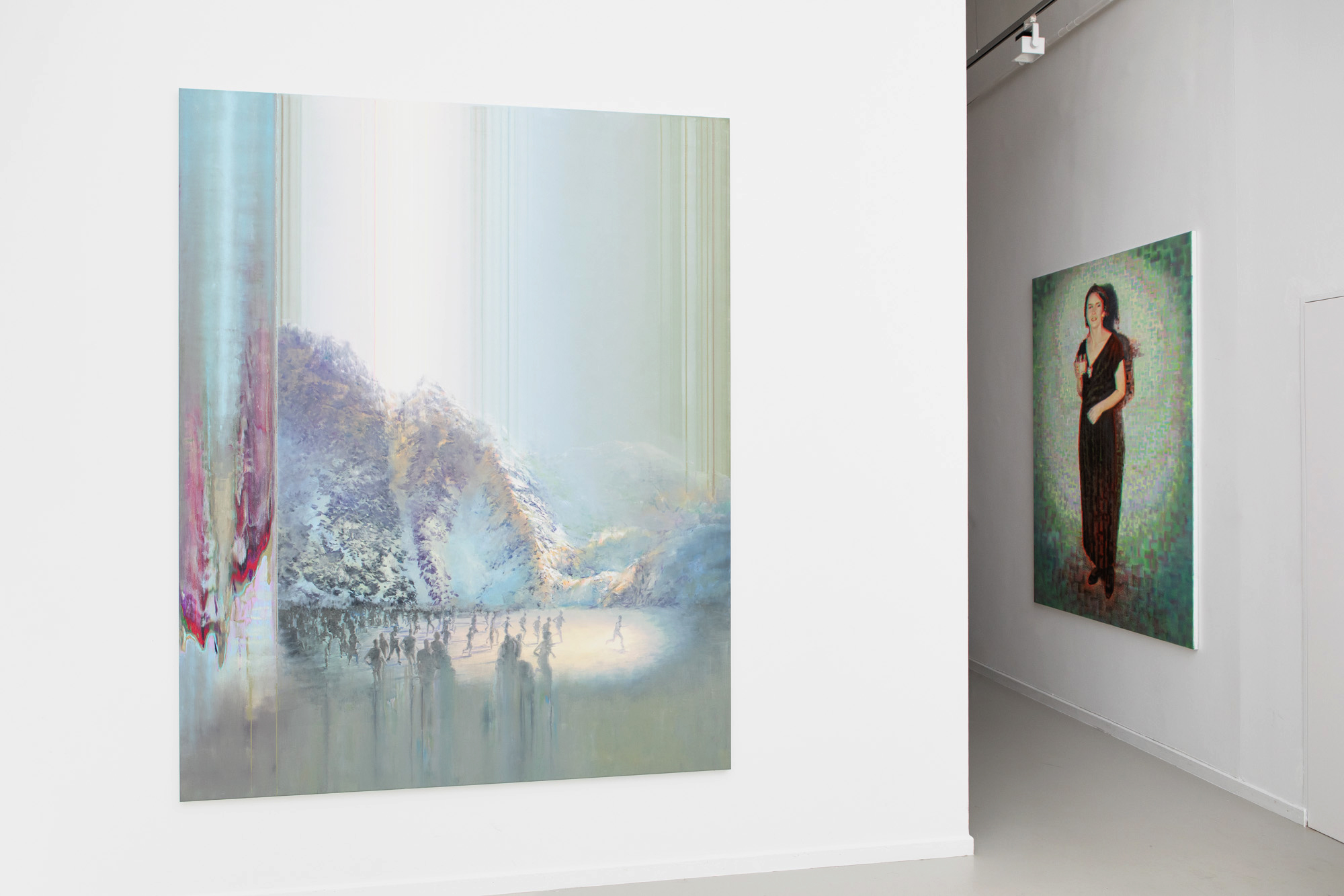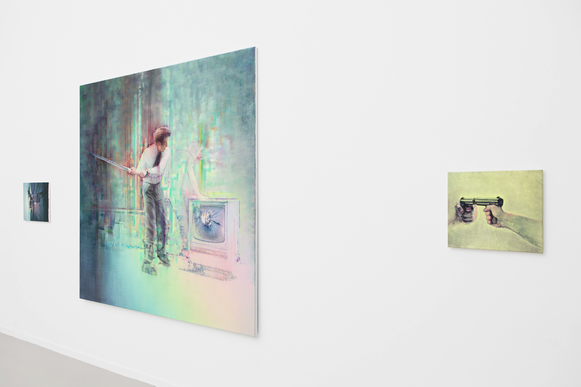 His monumental work, Escape appears at first glance to be a mesmerizing landscape in pastel colours. On closer inspection, however, it seems more haunting and disturbing, as a group of people fleeing from reality into the digital world—or vice versa—confront the disintegration of the reality they once knew and search for their new place in either world. This work, like the other paintings in the exhibition, is charged with secrets and tensions. A pair of pistols turned toward one another, hands slipping something into a pocket, an enigmatic body waiting behind a curtain or hidden beneath cascading hair, and a powerfully lit handshake of figures encircled by shining stripes—all evoke unease, while conjuring a moment torn out of space and time and its inherent elusiveness.