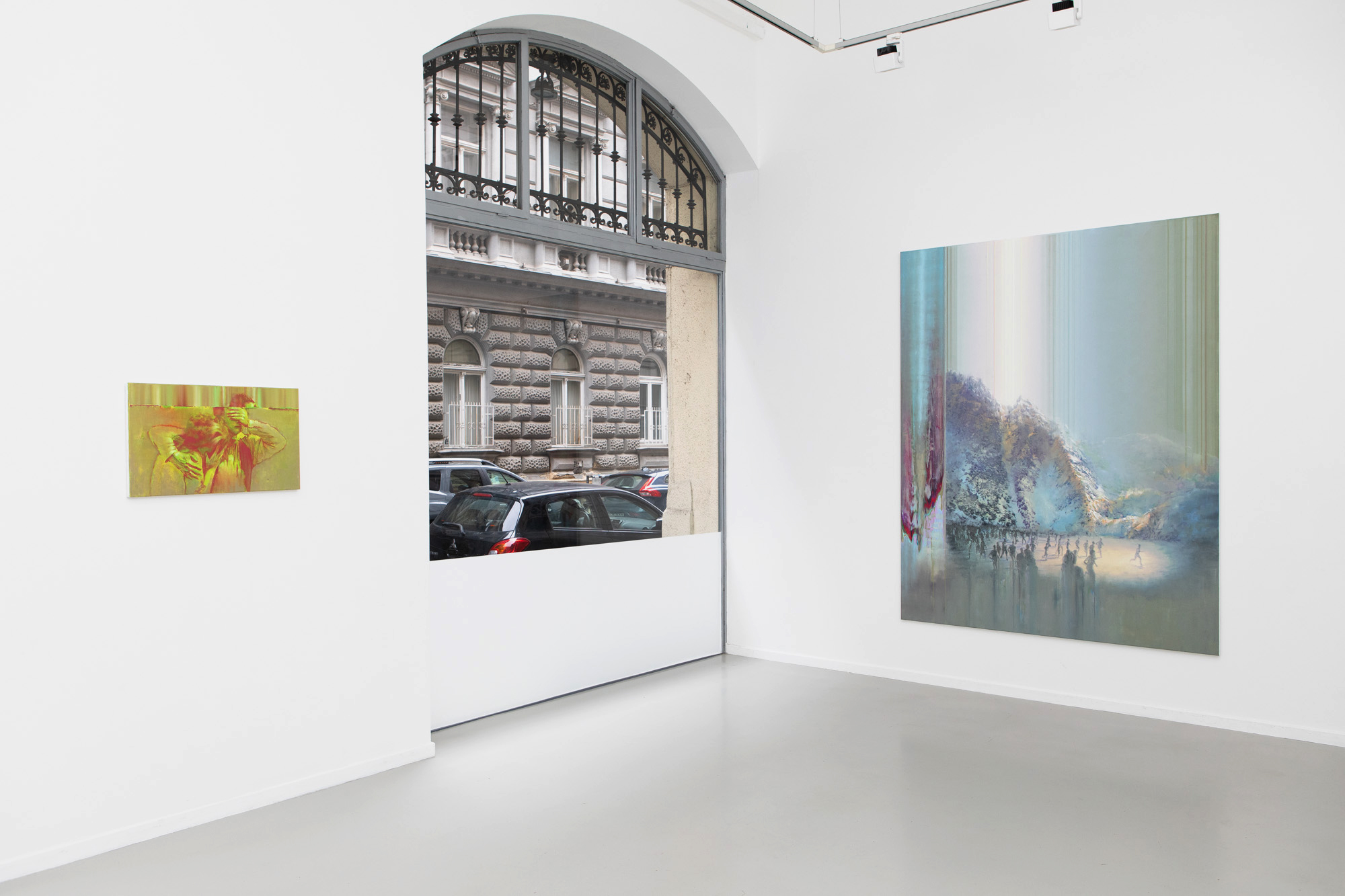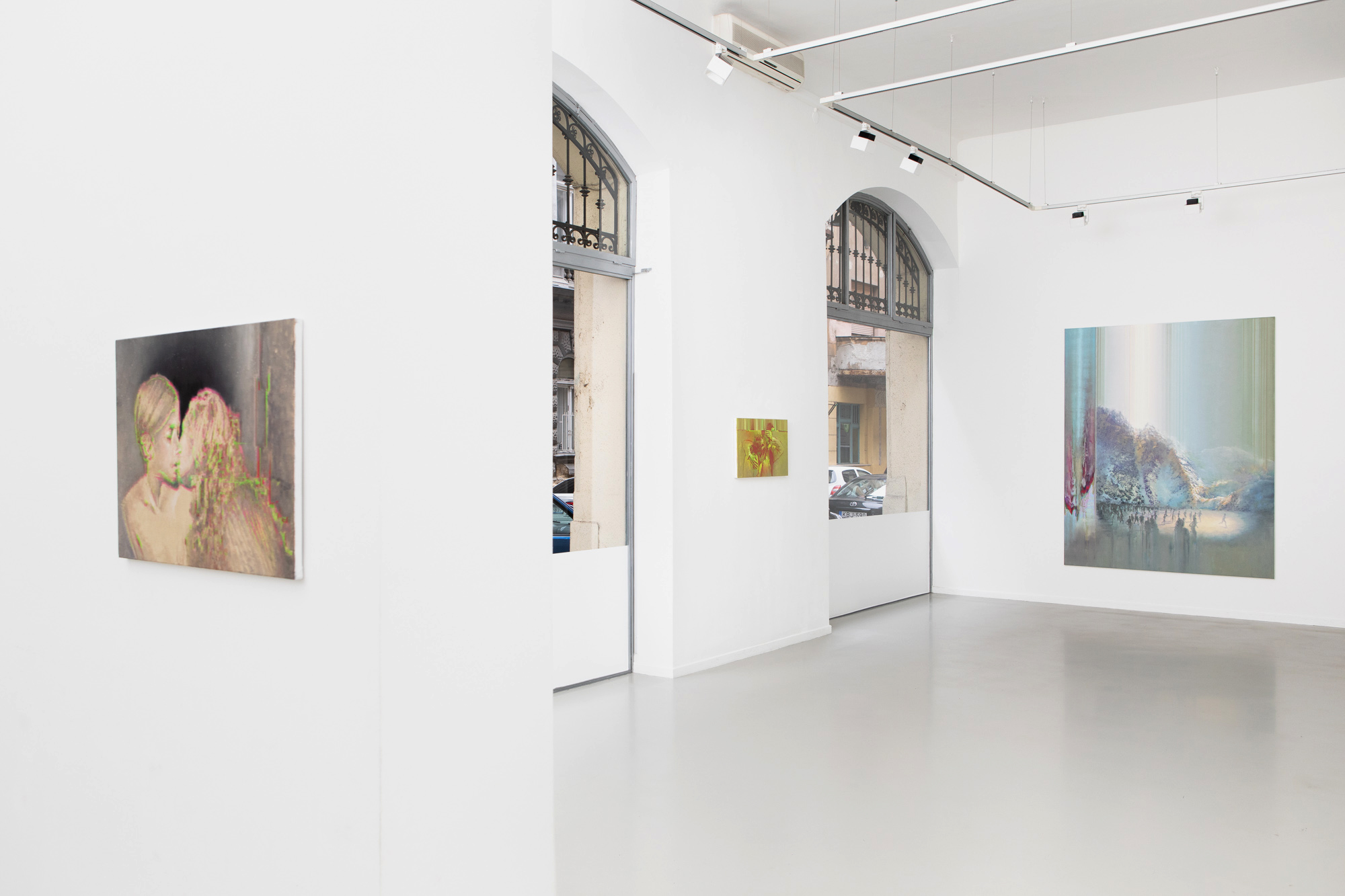 Monumentális műve, az Escape, első ránézésre egy pasztellszínekben úszó igéző tájkép. Közelebbről vizsgálva azonban inkább kísérteties, ahogy a valóságból a digitális világba – vagy éppen onnan – menekülő emberek csoportja keresi új helyét, valahol a látómezőn túl. Ez a mű, mint ahogy a kiállításon szereplő többi festmény is, titkokkal és feszültségekkel telített. Az egymással szembeforduló pisztolypár, egy zsebbe nyúló kéz, a függöny mögött várakozó és hajkorona mögé bújtatott rejtelmes nőalak, vagy a felismerhető képi elemek spontán absztrakcióba fordulása, a térből és időből kiszakított pillanatot és annak megfoghatatlanságát idézi.