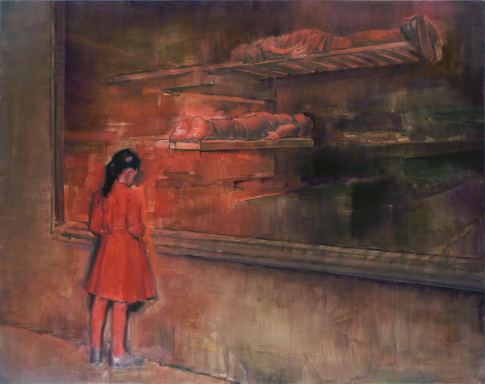 There is something disquieting about this diptych. The longer I look at it, the more powerful is the tension between the deeply personal and, now and then, the frighteningly impersonal. I myself would give this diptych the title The Spy who is Spied Upon, and this title would not be alien to the pictures of Attila Szűcs’s world, since there is something ghostly about them. Often it seems we are witnessing a moment before a crime is committed, the crime itself being a mystery: it is not clear what has happened or what will happen, we only feel the approach of some sinister event. Concerning the tension between the personal and the impersonal, I am reminded of Buster Keaton, who Attila Szűcs has painted several times – this film character with the most disturbing of faces, because one can never tell what is going on inside his mind. Keaton is intriguing not because he is keeping a secret, but because he seems to belong only halfway to this world; although he is entangled in all kinds of happenings of this world, whatever happens to him, his face gives nothing away, as if he were not a living being, though he is very much alive. With one perspective he looks into the world, but with another perspective he looks past it and sees something that we will never observe. This is the mystery that must have inspired Beckett to cast the older Buster Keaton in the main role of his only film (Film, 1965). In a sensual way, Windows presents the borderline situation in Attila Szűcs’s painting that seems to him a terrain as familiar as home: it is here and it is there, and that is why its ontology is unfathomable. But can we call something that is unfathomable as familiar as home? Isn’t this more a question of the uncanny? In German they call it “unheimlich”. It means simultaneously ghostly, sinister, being disoriented. We need only look at his pictures Library at Night, The Girl in the Red Dress, Room with Red Curtain, Reconstructed Execution Chamber, or even Two Red Beds: disorientation emanates from them. They radiate disorientation. They appear to float outside space and time, in a state of weightlessness, although the scenes are extremely weighty. They are located at the intersection between the personal and the impersonal, at the point where one feels to be in control of oneself at last, whilst this “self”, the condensation of the ego, departs with the speed of light, as it does in the picture entitled Around 10-35 which presents the imagined and still-continuing Big Bang.
