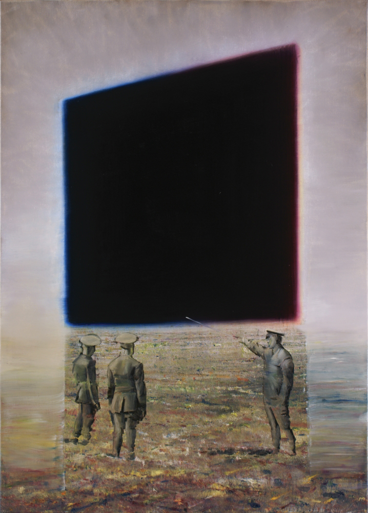Egy késő középkori táblakép – erre gondoltam azonnal, amikor megláttam az Felkészülés a sötétségre című festményt. Mint egy oltárkép, úgy függ a sötét négyzet a… – hogy hol? Erről majd később. Oltárkép, ez jutott eszembe róla, s ezt erősítette a rámutatás olyannyira hangsúlyosan ábrázolt gesztusa is. A jobbszélen álló figura mintha misét celebrálna a másik kettőnek, akik a gyülekezetet alkotják. A fekete négyzet pedig (s az egyszerűség kedvéért így fogom nevezni) nem is annyira függ, mint inkább lebeg, önerejéből, dacolva a gravitációval. És ettől van benne valami kultikusan ikonszerű – mintha nem is emberkéz alkotta volna, hanem maga az Isten bocsátotta volna alá az emberi világba. Úgy, ahogyan korábban Krisztust is. Ez a fekete négyzet, miközben oltárképként magasodik az előtte állók fölé, úgy hat, mintha Isten jelképe lenne, a szó legszorosabb értelmében: helyt áll érte, őt jeleníti meg. Az egyik odafent, a másik idelent, de közben lényegileg azonosak – fizikailag egyek. A lentinek a teste a fentinek a testével azonos. Ettől igaz test. Verum corpus, mondták a középkorban. S mert csak egyvalakinek volt valóban igaz a teste – nevezetesen Krisztusnak –, ezért a látható teste Isten képével is azonos. Nem egyszerűen felmutatja, hanem különbözőségében is egy vele. Igaz kép. Vera icon. Anagrammatikus változata: Veronika. Veronika kendője – igen, a nevezetes kendő, amelyet Veronika nyújtott oda Krisztusnak, aki a Golgotára menet ezzel törölte le arcról az izzadságot és a vért. A fekete négyzet Szűcs Attila festményén akár Veronika kendőjének egyfajta változataként is nézhető. Az eredeti kendő megőrizte Krisztus arcának lenyomatát, s ezzel az igaz képet, vagyis az egyetlen képet. Memlingtől Zurbaránig számos festő örökítette meg a kendőt, amely a művészet tárgya lett. De ezzel párhuzamosan a művészet is a hit tárgya lett. Nemcsak abban az értelemben, hogy a festészet egyes alkotásaiért szinte vallásos módon lehet rajongani. Hanem hogy a festmény – tágabb értelemben a kép – a hit tárgya tud lenni. Hiszünk a képekben, hiszünk azok valóságtartalmában, hiszünk abban, hogy amit látunk, az valami mögöttes igazságra utal, amelynek léte megkérdőjelezhetetlen. Szűcs Attila festményén e hitnek vagyunk szemtanúi. A feketeségen kívül semmit nem látni a lebegő négyzeten. És mégis: a három figura testtartása nem hagy kétséget afelől, hogy ők mégis látnak valamit. Olyan feszülten nézik a négyzetet, ahogyan a saját projekcióinkat szoktuk nézni. De hol van egyáltalán a fekete négyzet? A három ember egy síkságon áll, kopár, talán szikes talajon. A négyzet látszólag a levegőben függ, pár méternyire a talaj fölött. Ugyanakkor a kép két oldalán áttetsző, opálfényű fal zárja el a kilátást. Mintha egy hatalmas fal állna az előtérben, amelyből kivágtak egy ajtószerű nyílást, s a táj és a három alak ezen át lenne látható. Ettől az egészben van valami színpadszerű is. Különös módon a fekete négyzet is az opálos fal része. Az emberi alakok azonban furcsa módon miközben a fal mögött állnak, mégis a fekete négyzet előtt vannak, hiszen a jobboldali alak egyébként nem mutathatna rá a pálcájával. Arra viszont semmi nem utal, hogy a fekete négyzet ne az opálos fal része lenne. Hol van tehát? Az emberek előtt, és közben mögöttük is. Egyszerre, egyidejűleg. Fizikailag ez képtelenség. És mégis lehetséges – olyan elvek szerint, amelyek túlmutatnak a fizika törvényein. Az ilyen elveket nevezik metafizikaiaknak. A fekete négyzet: maga a testet öltött baljós metafizika. Az őt környező opálos fal maga sem tűnik fizikailag szilárdnak. Inkább mintha fényből lenne. A fekete négyzet sugározza magából ezt az opálos fényt, anélkül, hogy közben veszítene saját feketeségéből. Egy négyszögletes sötét nap. Az alkímiában ezt így nevezik: sol niger. A fénye beborítja a tájat, miközben ő maga mindentől érintetlenül lebeg. Olyan ez az egyszerre reális és mégis irreális fekete négyzet, mint a híres monolit Kubrick 2001 Űrodüsszeia című filmjében. Sugárzik a maga tökéletes hibátlanságában. Egy ismeretlen világnak az üzenete, semmit nem tudni róla, azt sem, hogy a múltból került-e vagy a jövőből. A három figura pedig úgy áll előtte, mint Kubrick filmje elején a majmok, az emberré válás küszöbén. Az egyik filmbeli majom a monolit látványának hatására ragad fel egy csontdarabot, amelyet eszközként kezd használni: elsőként egy ellenségét veri agyon vele. A monolit hatására a majomból ember lesz – gyilkoló gépezetet. A festményen a jobboldali figura kezében a pálca ugyancsak eszköz; s a három alak egyenruhája azt sugallja, hogy tőlük sem idegen a gyilkolás – egy gyilkoló katonai gépezet alkatrészei, mely gépezet maga az emberiség. E kijelentés patetikusságát a festmény vitathatatlan pátosza indokolja. Mert mit látunk? Embereket, akik a rejtéllyel – pontosabban a Rejtéllyel – állnak szemben, miközben nem veszik észre, hogy már nem is szemben állnak vele, hanem benne vannak a kellős közepében. Úgy hiszik, hogy előtte állnak, miközben látni, hogy mögötte vannak. Rámutatnak valamire, noha valójában az mutat le rájuk. Mint amikor valaki azt követően teszi fel a kérdést, hogy már megtalálta a választ. Ami egyébként korántsem ritka jelenség. Sőt, a lehető leggyakoribbnak mondható. Az ember születésétől haláláig kérdéseket tesz fel, mert mindig van valami, ami meghaladja a tudását, felülmúlja őt magát. A kérdések, legyenek mégoly banálisak is, annak jelei, hogy van valami, ami több az embernél. Kérdés kérdést szül, szokták mondani, s ennek csak a halál vet véget. Ahhoz, ho