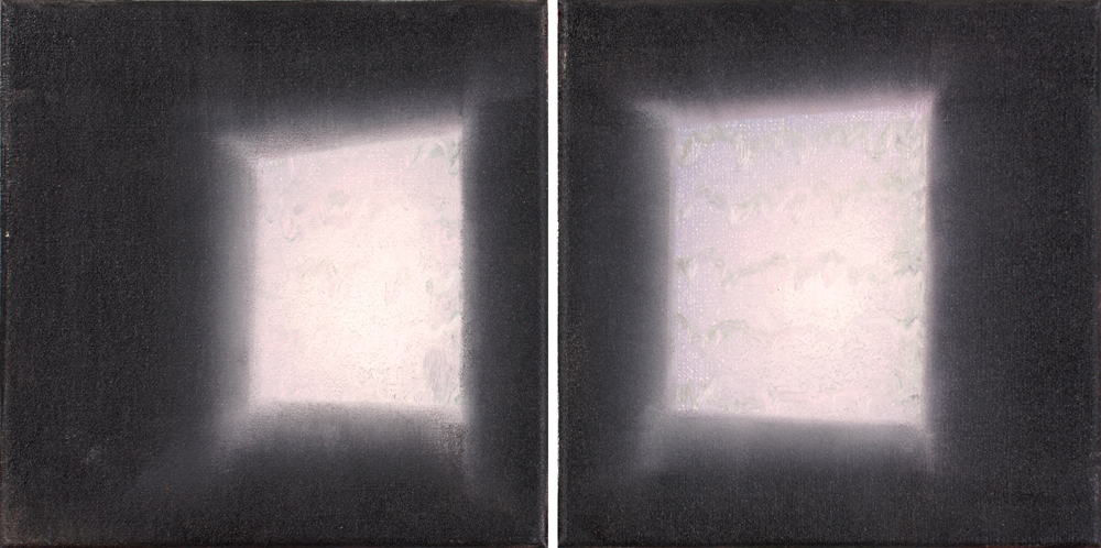 Szűcs Attila diptichonja is két világot jelenít meg. Még akkor is, ha tárgyaknak immár nyoma sincsen. Mintha két filmvásznat látnánk, amelyekre éppen egy tárgy nélküli filmet vetítenek. A világos nyílások eltérően helyezkednek el a sötét alapon, amitől a látvány térbeli lesz. Az egyiken a láthatatlan néző oldalt áll, s úgy áll a világos nyílástól jobbra, mint aki nem szeretné, hogy odakintről meglássák. A másikon közelebb lép az ablakhoz, s így nemcsak jobban kilát, hanem magát is megmutatja. Az egyiken: „én látok”. A másikon: „engem látnak”. A két kép pedig együtt olyan, mint egy szempár, és ezt sugallja: „látok, mert engem is látnak”. Az imént említett misztika egyik képviselője, Johannes Tauler szerint azért tudok látni, mert engem is lát Isten. A magam részéről ilyen messzire nem mennék. Ám e diptichont nézve megkockáztatom, hogy a látásomnak az az előfeltétele, hogy magam is látható vagyok. Nézek, s közben egy láthatatlan tekintet engem is figyel.
