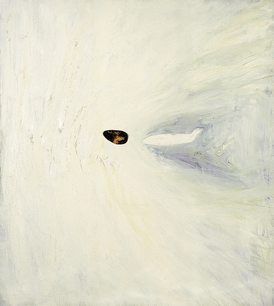 Although the above characteristics still hold true, the paintings exhibited here (especially the 1995 "Stereoscopic Hunters", or "Roses") are more restrained, purer exponents of this style, concentrating on fewer elements. The main components of a landscape - ground, horizon and sky - are clearly separate from each other; the layers of paint used for these areas show calmer brushstrokes, are less "action-packed", and they tend to retain one dominant colour. The picture in its entirety is made up of clearly defined patches of colour and shade. Images which in earlier works loomed vaguely out of the background are now more obviously detachable from their backgrounds, even come under the spotlight as it were, which makes them stand out and reduces the power of their surroundings. The emphasis is much more on the represented object, more specifically, on the object in relation to the empty, static space around it. Although there are landscapes, it is immediately obvious that these owe more to ideal constructs of the landscape painting tradition than to painting inspired by actual views. Szûcs's compositions are in many ways akin to the still life genre. His landscapes are simple in their anti-naturalness, there is always something missing from them, something which should or could be included. It is as if the omission of these elements is done deliberately to draw attention to the single object, which is singled out for close scrutiny on its own. In this way - slightly simplified - two mutually interrelated "events" rub shoulders in Attila Szűcs's paintings: the visible landscape or scene and the painting methodology. The former constitutes the narrative, and the latter comes in as a sort of "spanner in the works", allowing as it were for the expression of doubts or scruples. This material world is totally static. And since these fragmented elements of landscape exist in an unidentifiable medium, they become transposed onto a metaphysical plane, characterised by associations of infinity, silence, tragedy and an everlasting present. A good verbalisation of the effect these pictures produce can be found in the poetry of János Pilinszky :