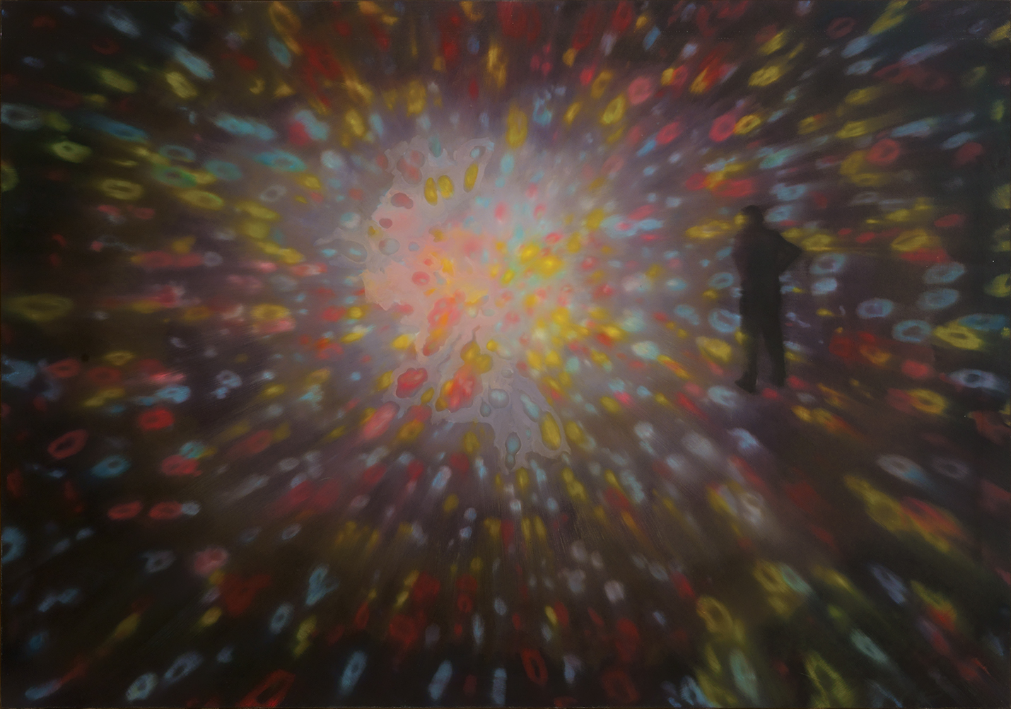 SZA: Nagyon érdekes, amit Bataille mondott, de nem volt célom, hogy ezek a felületek taszítóak legyenek. A hígítós fröcsköléssel közvetlenül párosuló élmény a festmény lebontása, ez valóban destruktív gesztus, fejesugrás a káoszba. Amikor megspriccelem a felületet, igazából nem tudom, hogy mi fog történni, ez benne az izgalom, a meglepetés faktor és a kockázat. Ez komoly feszültség, hiszen akár el is ronthatom. Ezek a felületek a spontán alakulás benyomását keltik, mintha egy természeti forma keletkezésének lennék a részese, miközben egy meglehetősen komplex építkezésről van szó. Az intelligens létezés olyan spektrumára pillanatok ilyenkor rá, amihez az intellektusomnak nincs hozzáférése. Ez kicsit összefügg azzal a törekvésemmel, hogy a festmény egész szövete, vagy felülete egységet mutasson, hogy ne lehessen szétszálazni ezt a komplex valamit. Ugyanakkor előfordulnak látványos csúszások, amikor a néző, ahogy említetted, elbizonytalanodik. Az előtér háttérré válik, és viszont, vagy a dolgok színessége, a percepció és azon keresztül a létezés egésze kérdőjeleződik meg. De nem vagyok biztos benne, hogy válaszoltam a kérdésedre.