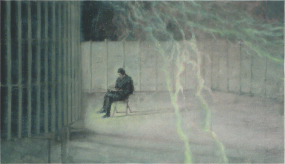 In cultural history then, light is both the fastest electromagnetic wave, and one of the most important metaphysical entities. Add to this that, unsurprisingly, it has a distinguished function in painting: it is a constituent, a technical element (chiaroscuro) and a mood-setting effect, which may become the very "protagonist". Though Attila Szűcs is not studying the dual nature of light (wave/corpuscle), nor is he meditating on its metaphysics, it is nonetheless undeniable that the various light effects often assume the chief role in his works. A good example, beside the already mentioned "minimalist" works (Sheets, 2006[p.94]; Crucible), is Playground with Lightning, 2002 (p.86). He had already painted a spherical climbing frame in the mid-1990s, but then the feel of the picture which used the elements of socialist realist visual culture – industrial ambience, metal (!) structure – was set by post-Nagybánya light effects and the melancholy of the red bench. Now bolts of lightning surround the structure, and there is an obvious link to the Tesla-pictures. In one of the latter, Tesla is sitting among artificial bolts of lightning, next to an experimental field-generating cage; in the other, he appears in a space dense with lightning bolts, beside a globular electromagnetic field that evokes the spherical climbing frame as much as the earlier blind spots and the later bubbles. The cultural associations range from Professor Öveges and his black-and-white popular science TV shows in the 1960s, through the emperor in Return of the Jedi who wields flashes of energy, to those mesmerising long-exposure photos of thunderstorms in National Geographic.